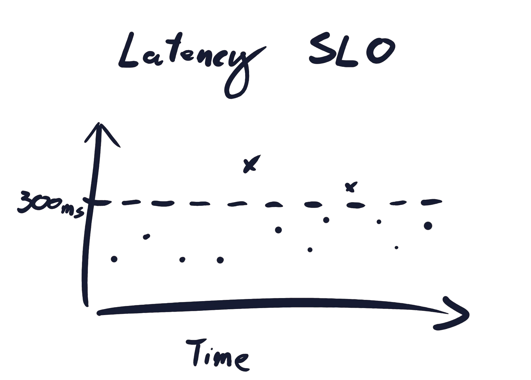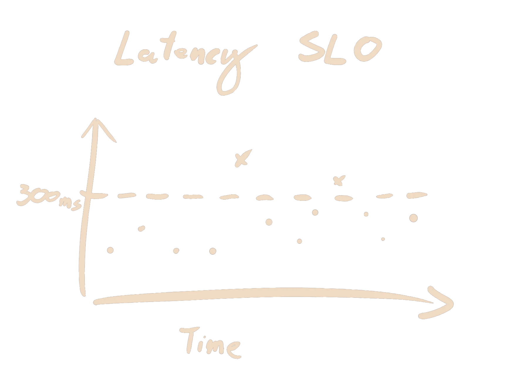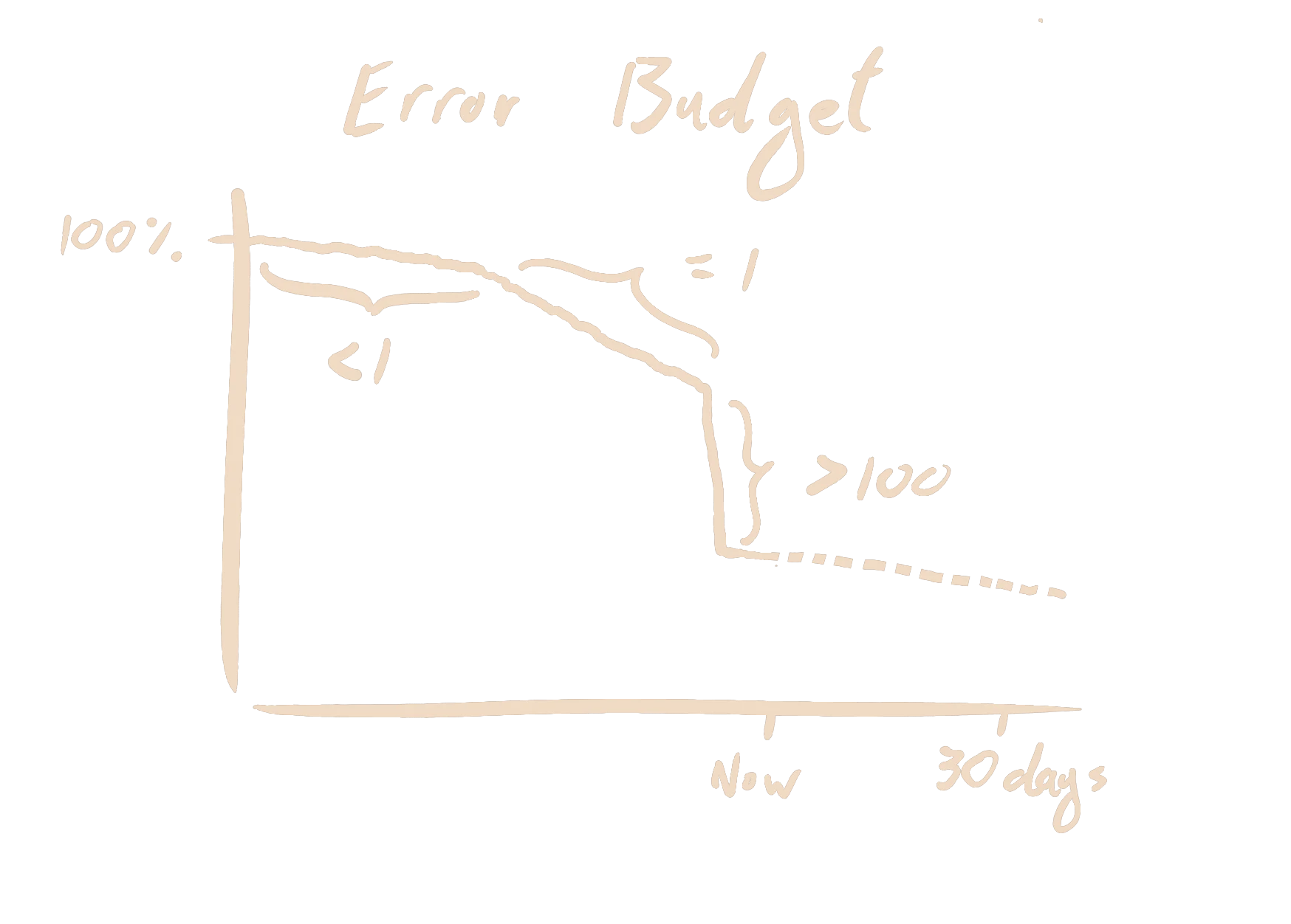 This is not difficult with SLOs. I simply record the latency of each request and count how many requests take more than 300ms. My users have short attention spans and completely forget anything that happened more than 30 days ago. For this reason, I record requests over a 30-day rolling window. In SLO terms, this means I have a budget of 0.1% slow requests over the last 30 days. Every slow request burns a little bit of that budget. The speed at which I'm burning through my budget is the burn rate, where a burn rate of 1 means that I am on track to deplete my budget at the end of the 30 day period. If I can act quickly to ensure that I never deplete my budget, then I will always have a manageable number of cranky users.